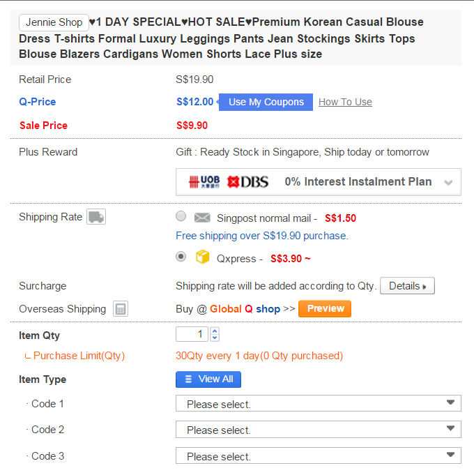 シンガポール【通販/ネットスーパー】 2015/11/15 シンガポールで通販【国内】Qoo10 追記・修正しました 家具付きの家に住むし、細々したものも 「足りないものはあっちで買えばいいんだよ」と言って シンガポールに送る荷物を決めてきたのだけれど。 引越しの荷物分けの際、あまり細々したものを送るのをお願いすることも出来ず、 いろいろ制限もあり、 さらに作業の後半は疲れきってどんどん捨て出し、 つまりは、意外とやっぱり色々足りないのです。 きっとどこかでは売っているのだろう、でも売ってる場所を知らない。 確かに売ってもいる、でもこれじゃないー、高いーとか。 そこでやっぱり… 通販だ!シンガポールに引っ越してから私を助けてくれた通販について、3つの項目でお伝えして言います! (1)シンガポール国内での通販 Qoo10 (2)日本からの海外配送 楽天海外販売 (3)受け取り方 シンガポール国内での通販 Qoo10 シンガポールで通販、まずは、 (1)シンガポール国内での通販 Qoo10。 日本にもサイトがあるけれど、シンガポール生まれ?の通販サイト 「Qoo10」 http://www.qoo10.sg/ 注文してもすぐには届かないし、間違いもあります でも便利です サイトの中にはたくさんの店があって、ようするに楽天みたいな感じ。 利用前に注意しないといけないのが、頼んだものが翌日に届くのは日本では当たり前でも、シンガポールでは違う、ということ。 日本でQoo10を利用したことがある方ならお分かりだと思いますが、品物が中国や韓国からの配送予定で数週間経っても届かない!っていうことがありますよね…。 Qoo10で頼む場合、 注文から手元に商品が届くまで1ヶ月以上かかることもある! 頼んだのと違うものが来ることがある! という2点について、覚悟が必要です。 なぜこんなにかかるかというと、在庫が中国や韓国にあり、特に中国の場合、中国国内での商品の移動に時間がかかったりで、1ヶ月以上届かない、なんてことも普通に起こります。 それを踏まえて・・・ 使い方がわからなかったら、日本のQoo10のヘルプを参照 購入にあたって困ることはそんなにないかもしれませんが、 楽天やamazonとは違うことも結構あるので、何かあればヘルプを参照…でも、もちろん英語です。 ここで役に立つのが日本のQoo10。日本語になっていますが、もともとのシンガポールの英語のサイトを日本向けにしてるので、使い勝手やサービスがほとんど同じ。 何かあれば以下の日本のQoo10のヘルプが役立ちます。 http://www.qoo10.jp/gmkt.inc/CS/NHelpHome.aspx それって英語でなんて言うの? さて、Qoo10に限りませんが通販を利用するにあたって、とっても困るのが 「それは英語だとなんていう名前になるのか」 ということです。 日本語をそのまま英語にしたら良いことばかりでもなく、カタカナの名前のものでも、 違うのもあるし…。 たとえば、日本では「ピアス」と「イヤリング」は別物ですが、こちらではピアスのことも「イヤリング earring」と言います。 欲しいものが英語で何というのか、まずはそれを調べるところからスタートです。 商品のサムネイルだけでは判断できない 1つのページに複数の商品 楽天、amazonあたりだと、通常色違いはあっても基本的に1つのページで扱うのは1つの商品だと思います。しかし、Qoo10では1つのページでかなりの点数の商品を取り扱っています。 例えば、以下のようなサムネイルの商品を検索でみかけたとします。 既に3つの商品が載っていますが… 実際には、この商品ページには100近い商品が紹介されています。 → こんな感じで、検索でみるサムネイルとはまったく違う商品(もちろんサムネイルの商品もありますが、探すのが大変…) 検索でみるサムネイルだけでは、欲しいものを探すのは難しいのがQoo10ですw。 価格さえも表記どおりにいきません さて、上記のように多様な商品を扱っているせいもあって、価格さえも油断できません。 Sale Price S$9.90と書いてあって「お、安い、この値段なら買おう」と思ったとします。 しかし、Qoo10では選んだアイテムによって、値段がプラスされるのが普通です。 ↓しかし、実際の欲しい商品を選んでみると+s$5.90…つまり実際には 9.90+5.90=S$15.80 するのです! 商品がたくさんあるので仕方がないかと思いもしますが、扱っている商品が数個しかないのに、そのすべてにプラスの価格の記載があったりすることもある(しかも結構な上乗せ)ので、記載されていることもあるので、注意が必要です。 送料と納期 Customer ReviewかQuestion&Answerをみてみる! これは楽天などと変わりませんが、配送方法によって送料が変わります。 上記のアイテムはトラックのマークなので、国内配送(国内に在庫がある)です。 国内配送の場合には、すぐ比較的早く届きます。遅くても1週間ぐらいかな。 納期の目安については、【Shipping Rate】 をクリックすると目安が表示されます。 normal mail なら5days、Qxpressなら2~3daysですね。 normalmailのアイテムは、小さければポストに投函されます。 注意しなくては