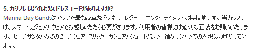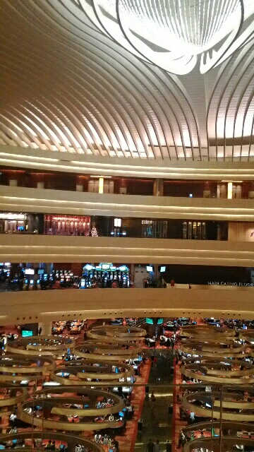 シンガポール【観光編】 2015/12/26 人生初のカジノ ベイサンズにて スマートカジュアルってなんだ!? せっかくシンガポールに住んだんだし、と思って、ついにやってきました、シンガポールのカジノ。 完全におのぼりさんです。 カジノなんて、映画(オーシャンズ11や13とか)でしか見たことないので、どんなものなのかがまったくわからず、なんとなーく「カジノって夜だけやっているの??」みたいなアホなことも思っていました。 注:カジノの中に入ったら撮影禁止です。 これは、ザ・ショップス2階の高級なレストランが入っているエリアの廊下から撮影。 画像ではあまり伝わらないかもしれませんが、ひろーいフロアにテーブルとスロット台と人がいっぱい。圧巻でした。 ちなみにこの写真を撮った場所に来たのは、奮発して日本食の「Hide Yamamoto」のランチを食べてみよう、という理由だったのですが…。 事前にネットで調べたら一番安いのは38S$だったのに、実際に行ったら80S$が一番安いやつになっており、週末だからなのかこの時期だからなのか、80S$なんて絶対無理なので食べませんでした。 HIDE YAMAMOTOのメニュー (ランチメニューは三段目の一番左です) いざカジノへ ベイサンズ側の入り口から近づくと…高そうな時計を売っているお店やらなんやらがいっぱい。儲かったら買えってことですか!?w カジノの入り口。人が並んでいます。 奥のほうにカジノが見えて、「うわー、昼でもやってる、人いっぱい!」←当たり前ですw 入り口の並びにはATM、いつでもお金をおろせる危険な状態です。 入り口には注意書きの看板みたいなのが立っていて各国語で書いてありますが、日本語はありません。日本人はあんまり来ないのかしら…。 カジノには大きな荷物は持って入れません。肩掛けのカバンとかは大丈夫です。 大きめの荷物を持っている場合には、カウンターに預けられます。 シンガポール国籍の人と、永住権所持者は、入場にあたり100S$かかるそうです。 100S$って…。聞いた話ですが、入場料がかかるので、シンガポールの人はマレーシアのカジノに行くのだとか。 外国籍の人は、タダで入れます。 入場審査は厳密です でも格好はなんでもいいみたい 私たち夫婦は日本国籍で、うちの旦那様はEmployment pass、私はDependent passを持っています。外国籍であることは間違いないので、パスポートを提示することにしました。 さて、この入場審査、実にちゃんと行われます。 空港の入国審査ばりです。脱帽なんて当たり前。 パスポートの写真と本人の顔を見比べ、なんと渡航記録もじっくり見るんです。 渡航記録を見れば、シンガポールへの入出国のスタンプが押されていない(指紋認証のゲートを利用しますもんね)し、うちの旦那様はアジア各国にしょっちゅう出張に出ているので、怪しさ爆発です。 こわもてのカジノの人に「何かしらのカードを持っているよね?」と聞かれました。 そして、パスを出すと、パスの写真と本人の顔を見比べて…通してくれました。 どうやらパス所持者はパスを出せば良かったようで…。 シンガポールは三人に一人が外国籍だと言われていますが、私が並んでいる間、ほとんどの人がパスポートではなくパスを握り締めていました。 このカジノに来るのは外国からの旅行客より、国内に住む外国籍の人のほうが多いんだなぁ…。 ちなみに私が列を待つ間、1人だけ入場審査で「お帰りください」と怒られて?追い出されている人を見ました。パスを持っていたと思いますが、何がダメで入れなかったのかはわかりませんが(友達のパスを借りたりしたのかなぁ?)、 お金を使ってくれれば誰でもいいわけではなく、入場のルールは厳格に守られていると感じました。 でも格好はなんでもいいみたい スマートカジュアルってなんだ? ↑カジノのドレスコードについての記載 カジノにはドレスコードがあると聞いていたし、書いてあったので、それなりにちゃんとした格好で行ったのですが…。 実際には、ビーチサンダルの人も、ハーフパンツの人もTシャツの人もいっぱいいました。袖なしシャツって良くわかりませんが、ノースリーブの人もいっぱいいました。 パスポート等で身元がはっきりしてさえいれば、何を着ていても、履いていてもいいみたいです。 ちなみに、カジノと合わせて初めてベイサンズにも泊まっているわけですが、こちらもあちこちドレスコードがあるはずなのに、まったく守られていないと感じます。 シンガポールでビーサンや半パン無しなんて難しいだろうと思いつつも、ホテルのウェブサイトにあったようにスマートカジュアルで行った我々夫婦は少しガッカリしましたw ベイサンズは5つ星高級ホテルのはずですが、宿泊客もすごく多いですし、みんながマナーを守るのは難しいのかもしれません。 テーブル席に挑戦する勇気なんてありません! カジノは3階まであり、たくさんのスロットとポーカーなどのカードゲームのテーブルがあります。 嬉しいことに飲み物はタダ